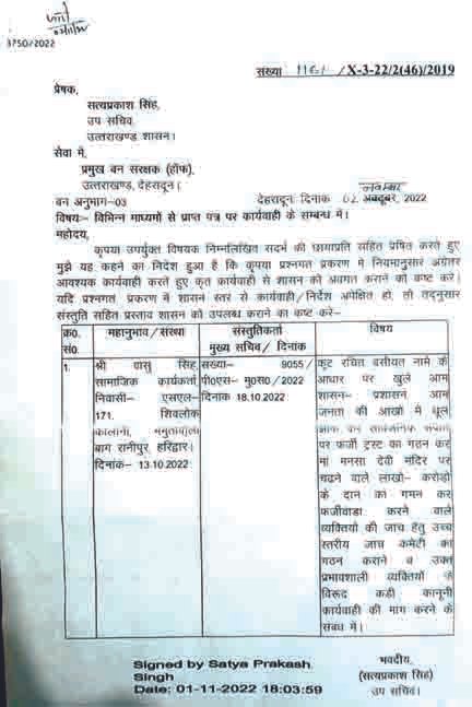 हरिद्वार। मंशा देवी फर्जी ट्रस्ट विवाद व मंदिर में आने वाले करोड़ों रुपये के चढ़ावे के फजीवाड़े का मामला तूल पकड़ता जा रहा है। अब उप सचिव सत्यप्रकाश सिंह ने…