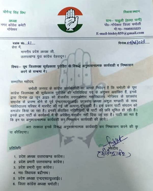 गोपेश्वर (चमोली)। कांग्रेस के अनुशांगिक संगठनों के साथ ही कांग्रेस पार्टी की ओर से चमोली जिला यूथ कांग्रेस के जिलाध्यक्ष सूर्य प्रकाश पुरोहित को पद से हटाये जाने की मांग…