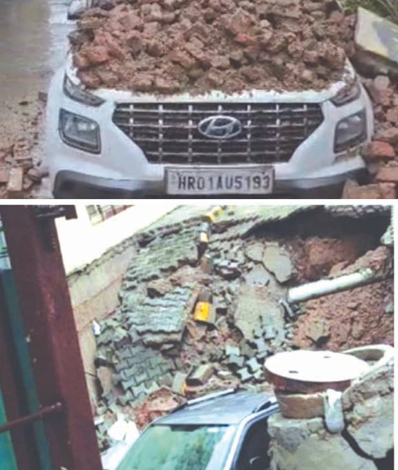 कार पर गिरी दीवार तो दूसरी सड़क में समाई