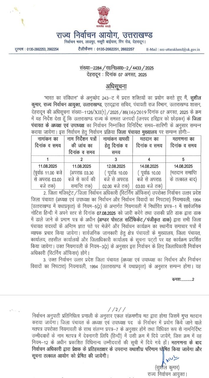 देहरादून। जिला पंचायत अध्यक्ष, उपाध्यक्ष तथा ब्लॉक प्रमुख, ज्येष्ठ उप प्रमुख तथा कनिष्ठ उप प्रमुख के चुनाव के लिए राज्य निर्वाचन आयोग की ओर से अधिसूचना जारी कर दी गई है।