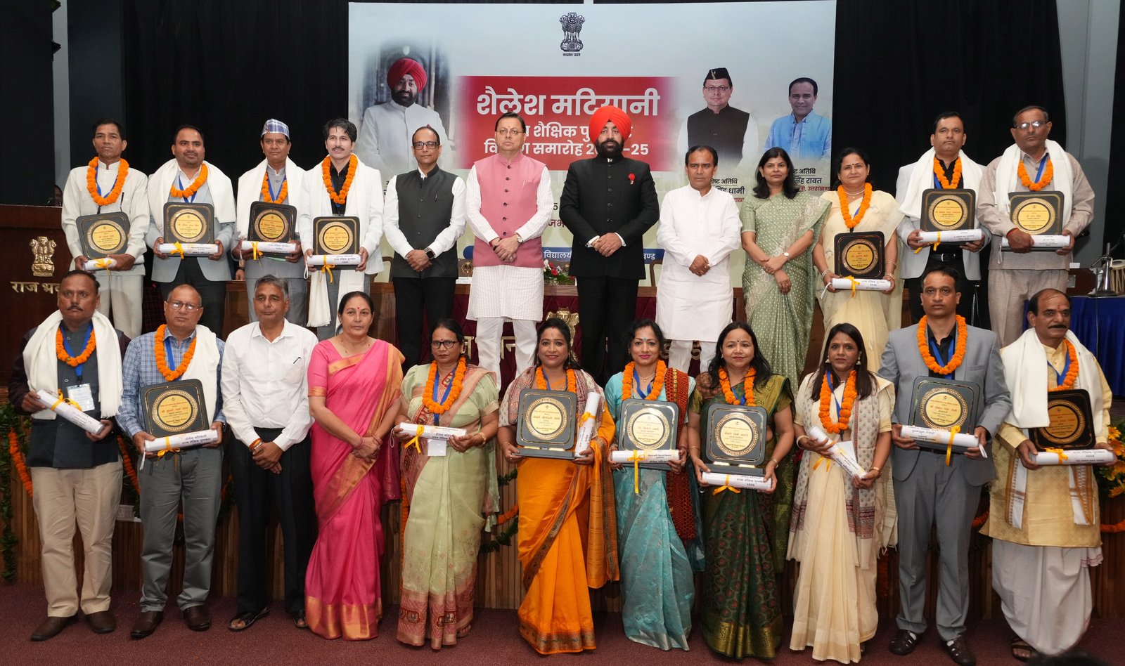 देहरादून। शिक्षक दिवस के अवसर पर शुक्रवार को राजभवन में ‘‘शैलेश मटियानी राज्य शैक्षिक पुरस्कार’’ सम्मान समारोह आयोजित हुआ। समारोह में राज्यपाल लेफ्टिनेंट जनरल गुरमीत सिंह (से नि), मुख्यमंत्री पुष्कर सिंह धामी और शिक्षा मंत्री डॉ. धन सिंह रावत ने वर्ष-2024 में शैलेश मटियानी राज्य शैक्षिक पुरस्कारों के लिए चयनित 16 शिक्षक एवं शिक्षिकाओं को सम्मानित किया। वर्ष-2024 में चयनित 09 प्रारम्भिक शिक्षक, 05 माध्यमिक शिक्षक, 01 शिक्षक प्रशिक्षक एवं 01 संस्कृत शिक्षक को यह सम्मान प्रदान किया गया है।